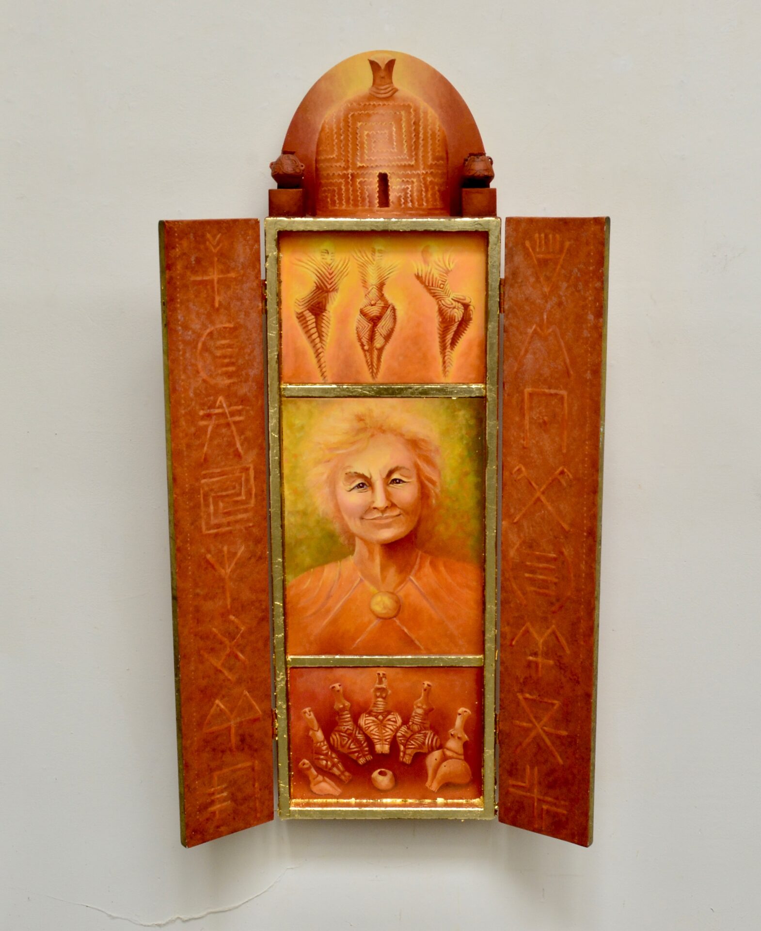 Paint on canvas and wood, gold leaf, sculpted clay vessels, copper