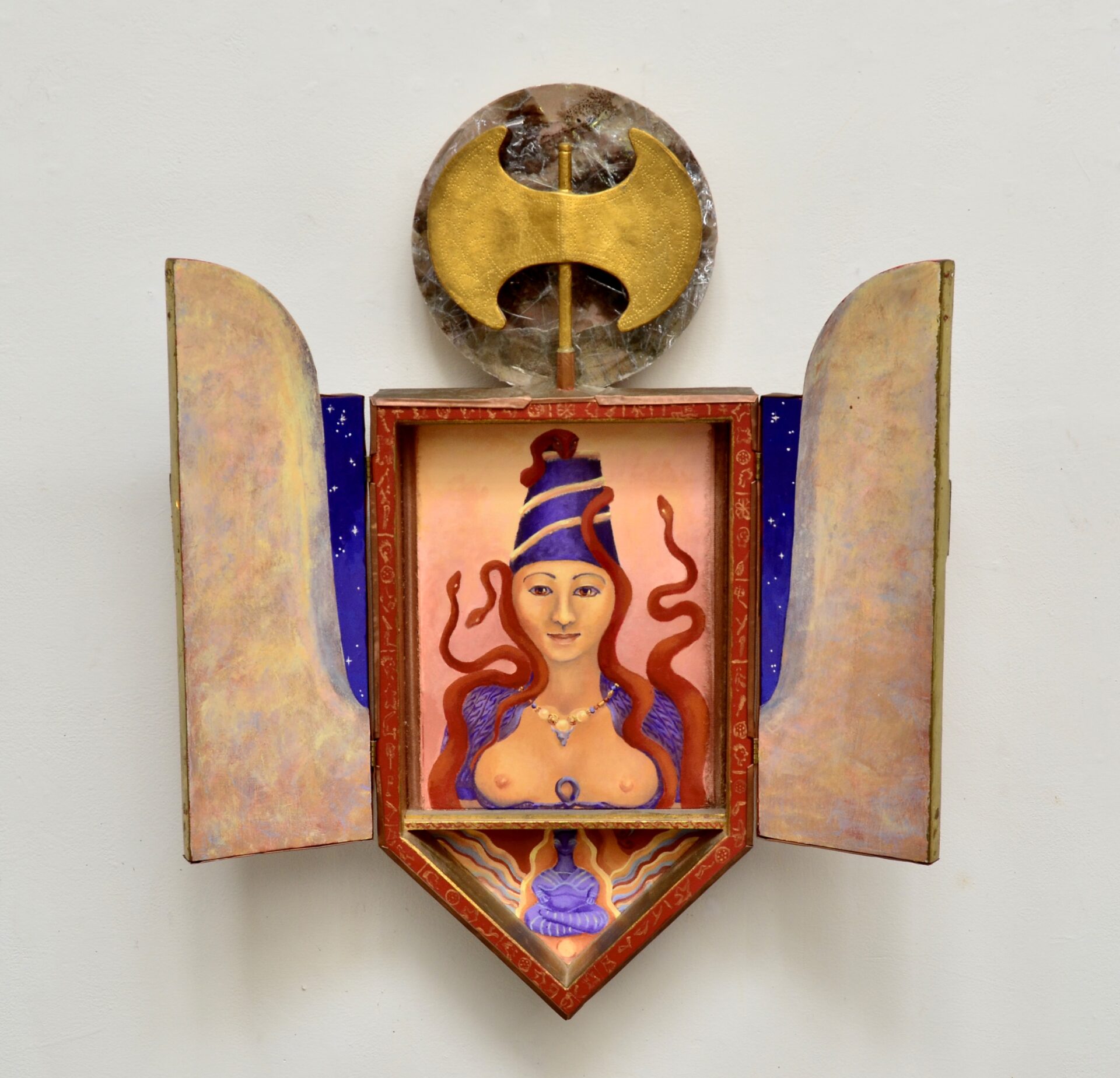Paint on wood and canvas, Mica, gold leaf, incised copper 29”H x 23”W x 4”D with doors open 29”H x 12”W x 5”D with doors closed.
