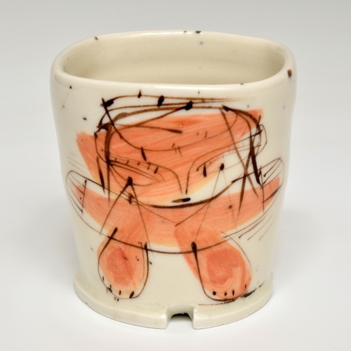 Porcelain, brushwork with stains, 3.25 x3.5 x 3.5″. cone 9 oxidation. clear glaze
