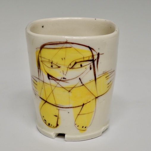 Porcelain, brushwork with stains, 3.25 x2.5 x 2.5″. cone 9 oxidation. clear glaze