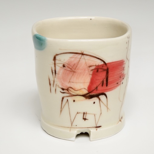 Porcelain, brushwork with stains, 3. x2.75 x 2.75″. cone 9 oxidation. clear glaze