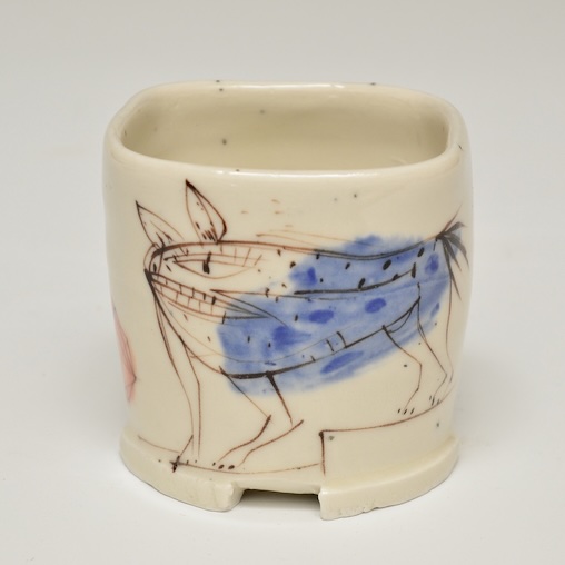 Porcelain thrown, Brushwork with stains, clear glaze, fired to cone 9 oxidation  3.25 x 3.25 x 3.25″