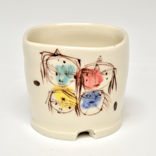 Porcelain thrown, brushwork with stains, clear glaze, fired in oxidation to cone 9 3.25 x 3.5 x 3.5″