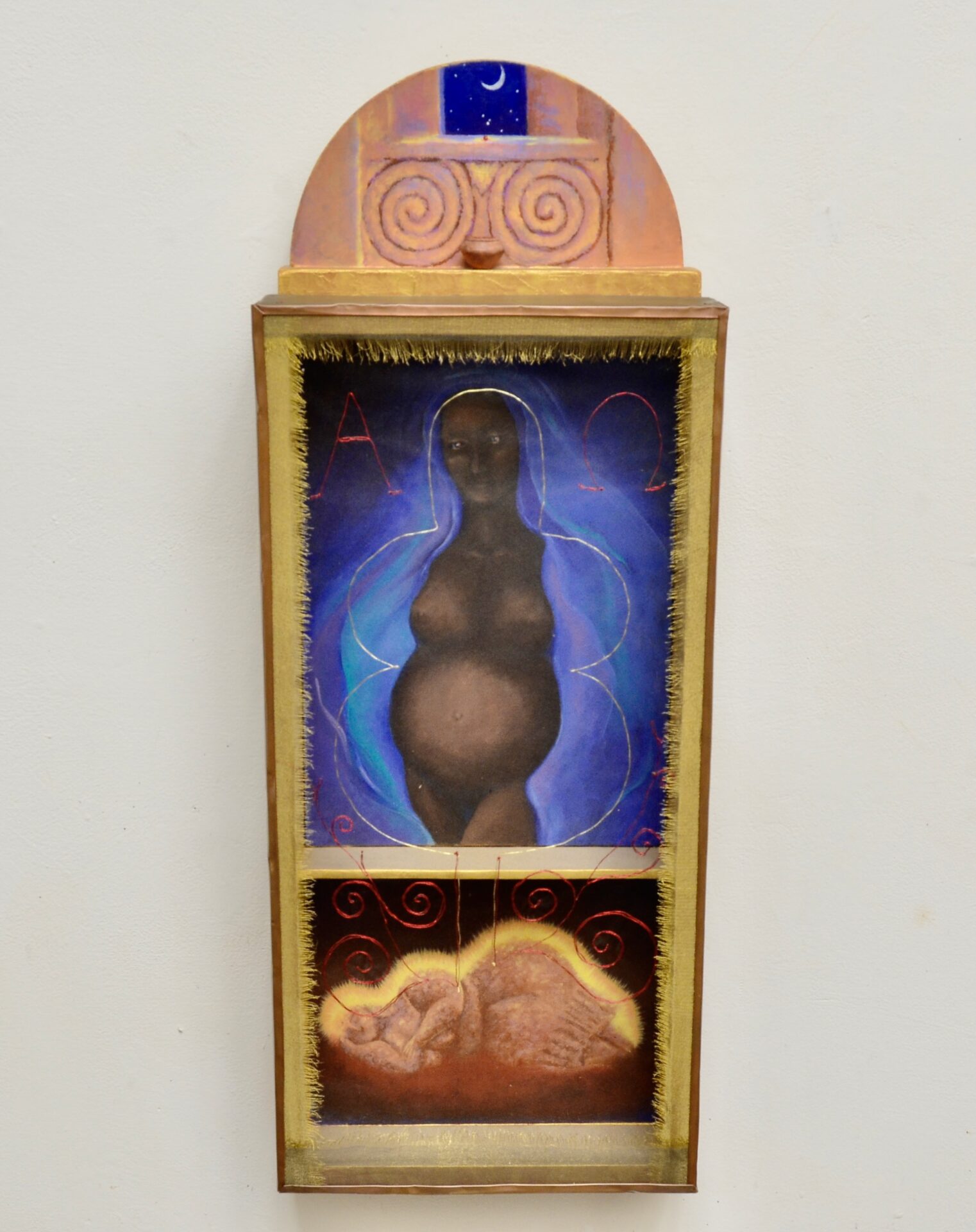 Paint on canvas and wood, stitched drawing on transparent fabric overlay, sculpted clay vessel, copper 30”H x 11”W x 4”D.