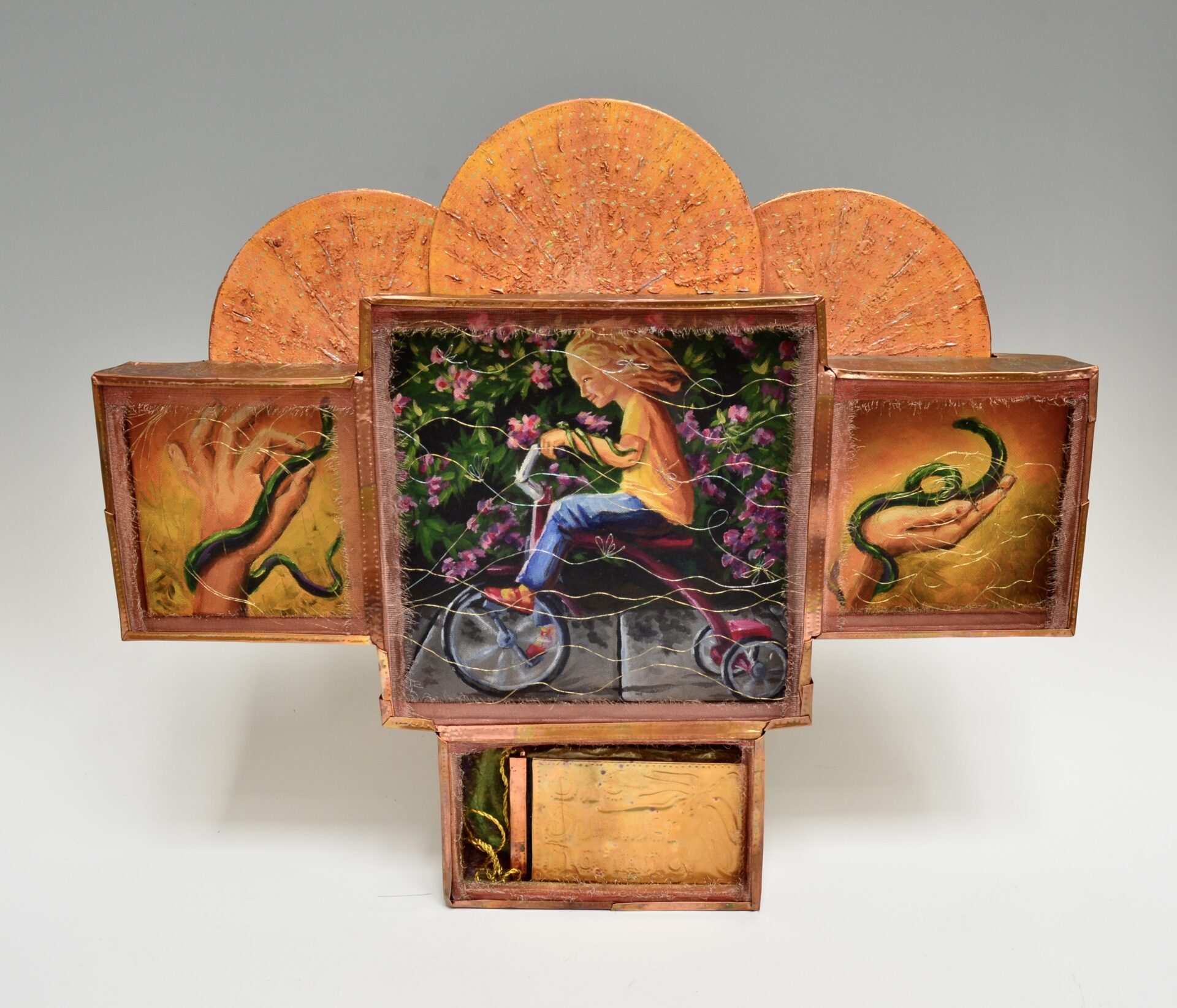 Paint on canvas, drawings in thread on transparent fabric overlays, silk, copper, book with handmade paper collage pages 20”H x 23”W x 3”D.