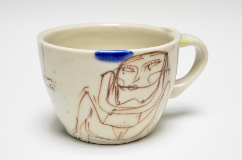 Collaboration: Sandy Simon porcelain thrown cup cone 9 oxidation fired. Robert Brady drawing with stains, clear glaze. 2.5 x 4.5 x 3.25″