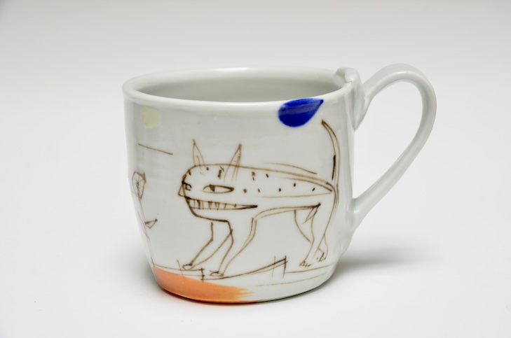 Robert Brady drawing on Sandy Simon’s thrown porcelain mug. All fired to cone 9 oxidation. 3 x 5 x 3.5″