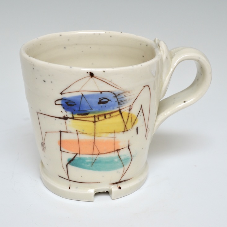 Wheel thrown porcelain with a pulled handle. cone 9 oxidation, hand brush work stains and clear glaze 3.5 x 4.5 x 3.25″