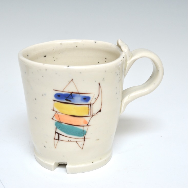 Wheel thrown porcelain with a pulled handle. cone 9 oxidation, hand brush work  stains and clear glaze 3.5 x 4.5 x 3.25″