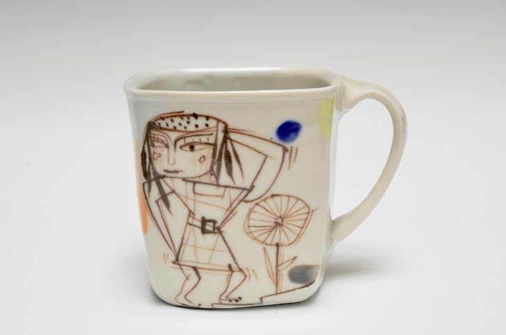Robert Brady drawing on Sandy Simon’s thrown porcelain mug. All fired to cone 9 oxidation. 3.25 x 4.25 x 3″