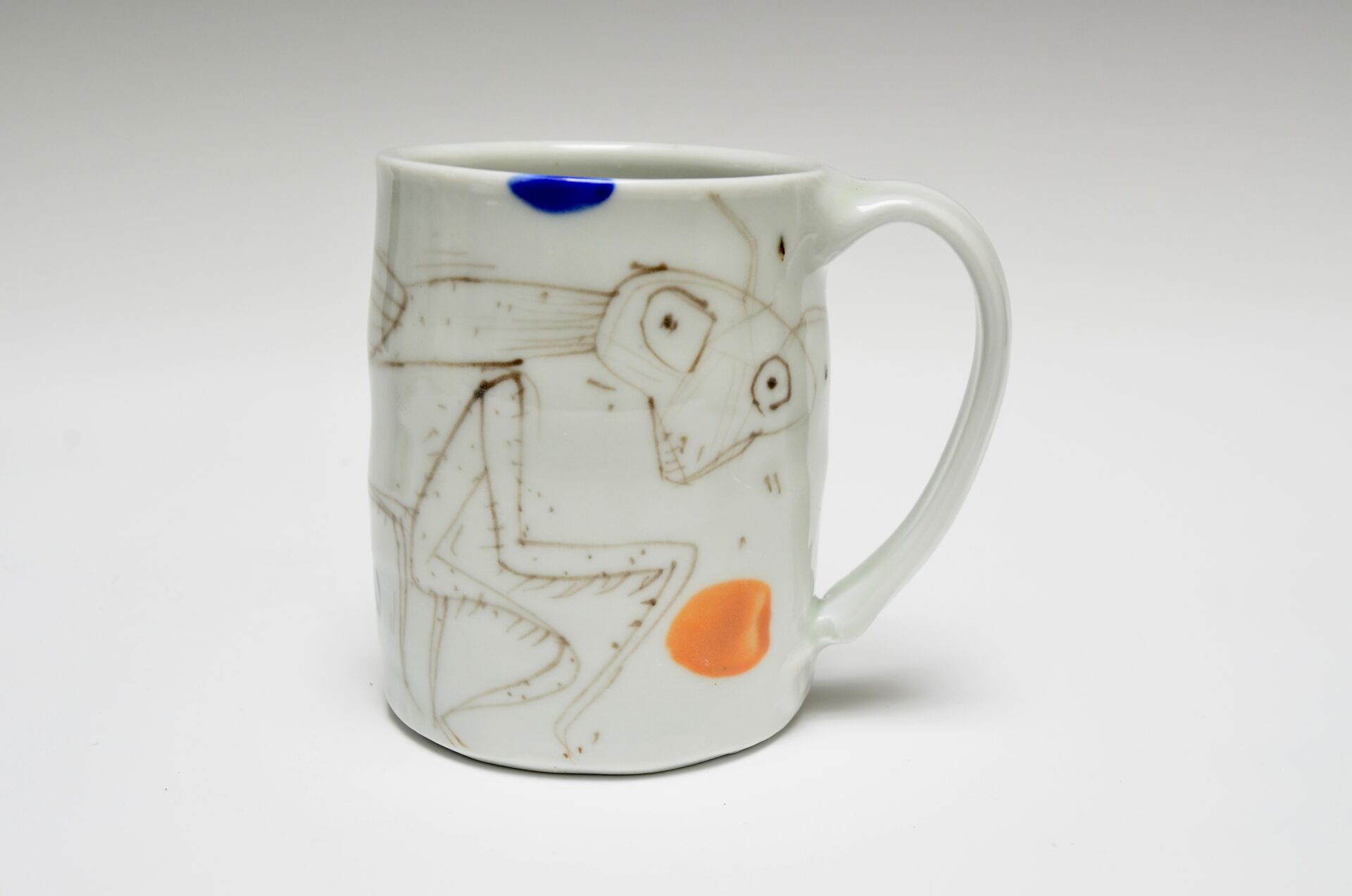 Robert Brady drawing on Sandy Simon’s thrown porcelain mug. All fired to cone 9 oxidation. 4 x 4.5 x 3.25″