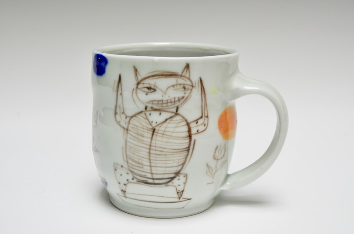 Robert Brady drawing on Sandy Simon’s thrown porcelain mug. All fired to cone 9 oxidation.4x 4.5 x 3.25″
