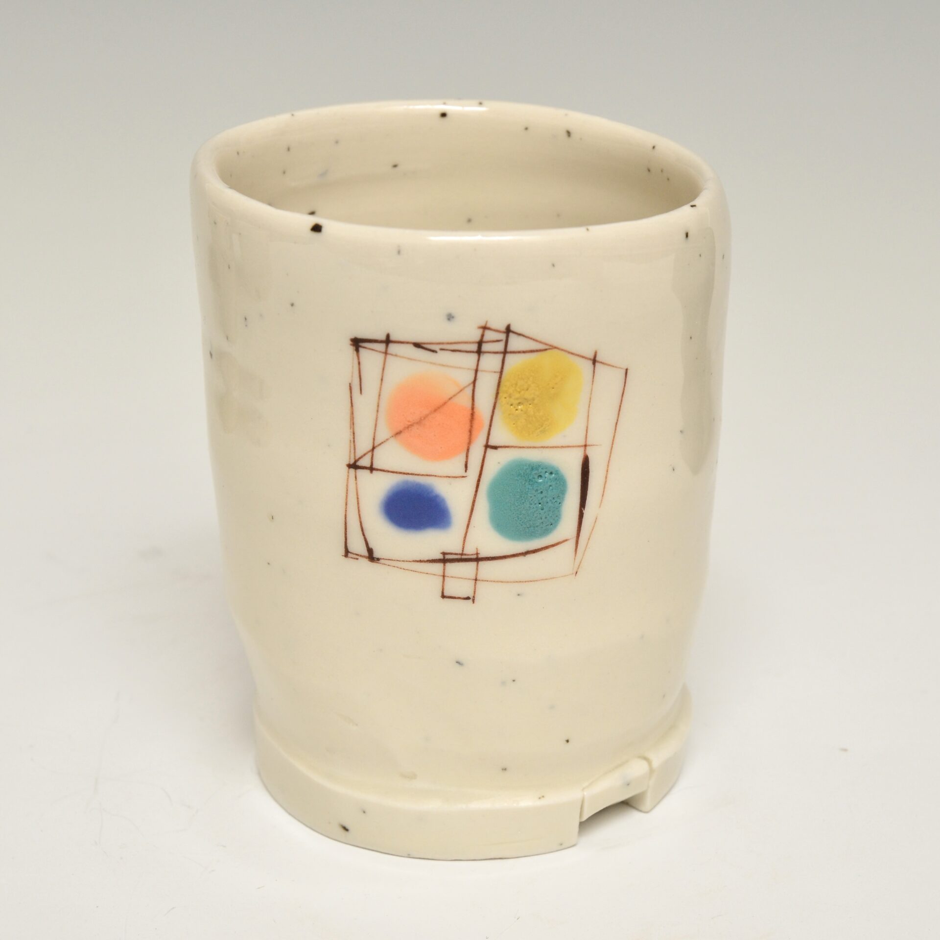 Wheel thrown porcelain with a pulled handle. cone 9 oxidation, hand brush work stains and clear glaze 4 x 3 x 3″