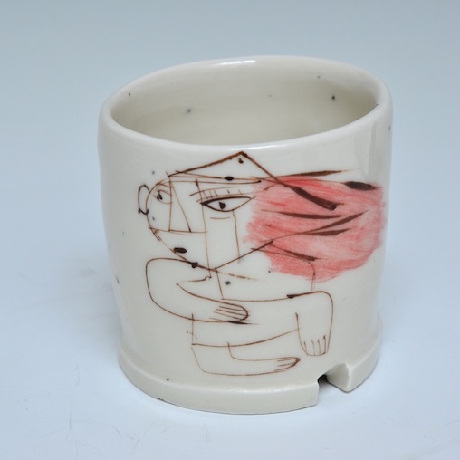 Wheel thrown porcelain with a pulled handle. cone 9 oxidation, hand brush work stains and clear glaze 3 x 3 x 3″