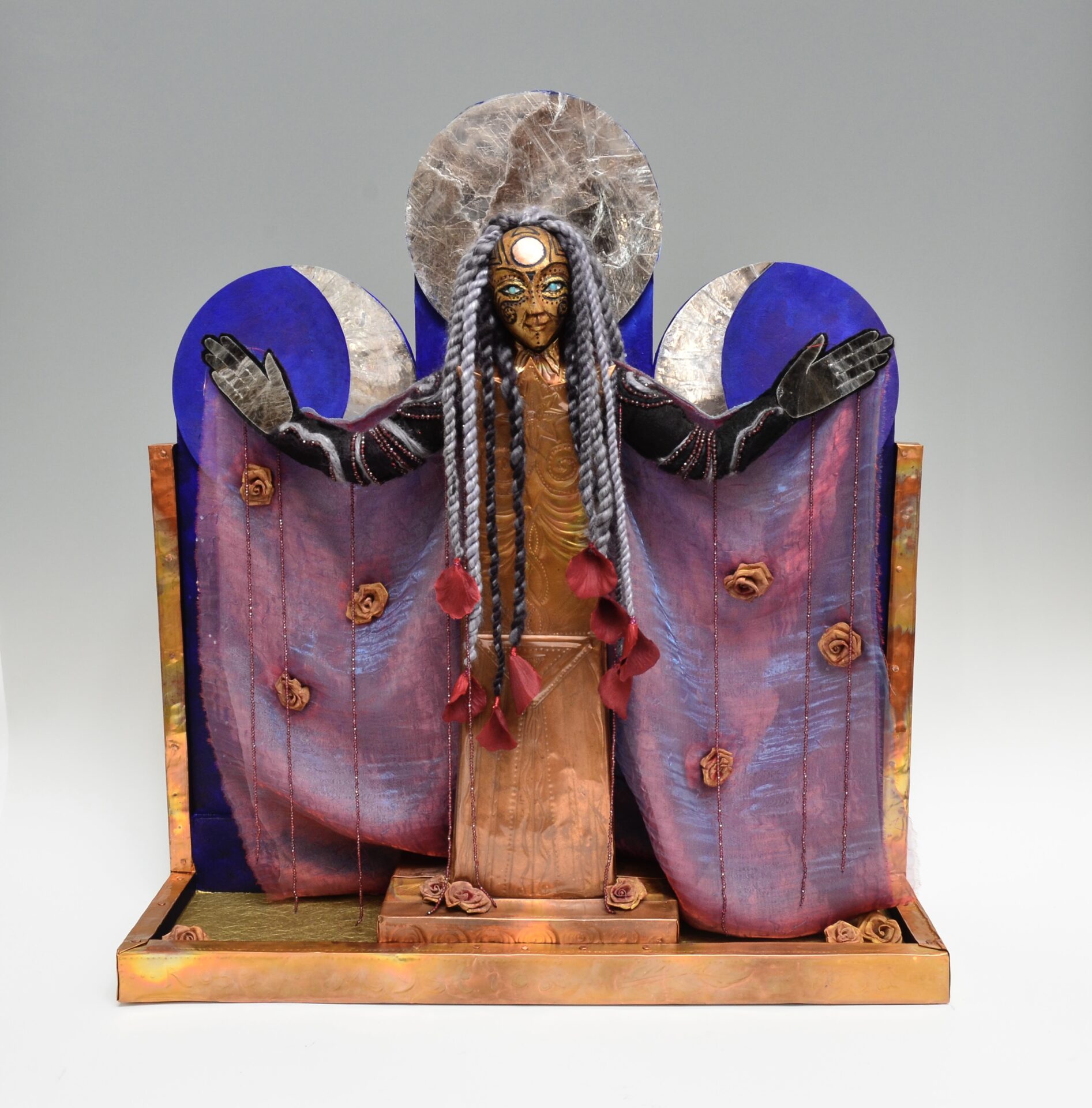 Carved wood head with black opal eyes, wool and silk hair, felted arms embroidered with garnets, hands and moons of mica, incised and repoussee copper, paint on wood, silk fabric, garnet and labradorite beads.