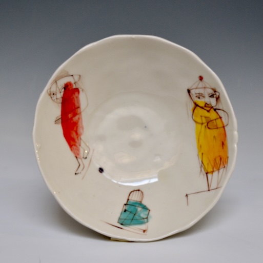 Salad bowl, thrown porcelain, brushwork with stains and a clear glaze fired in oxidation to cone 9. 1.75 x 7.5 x 7.5″