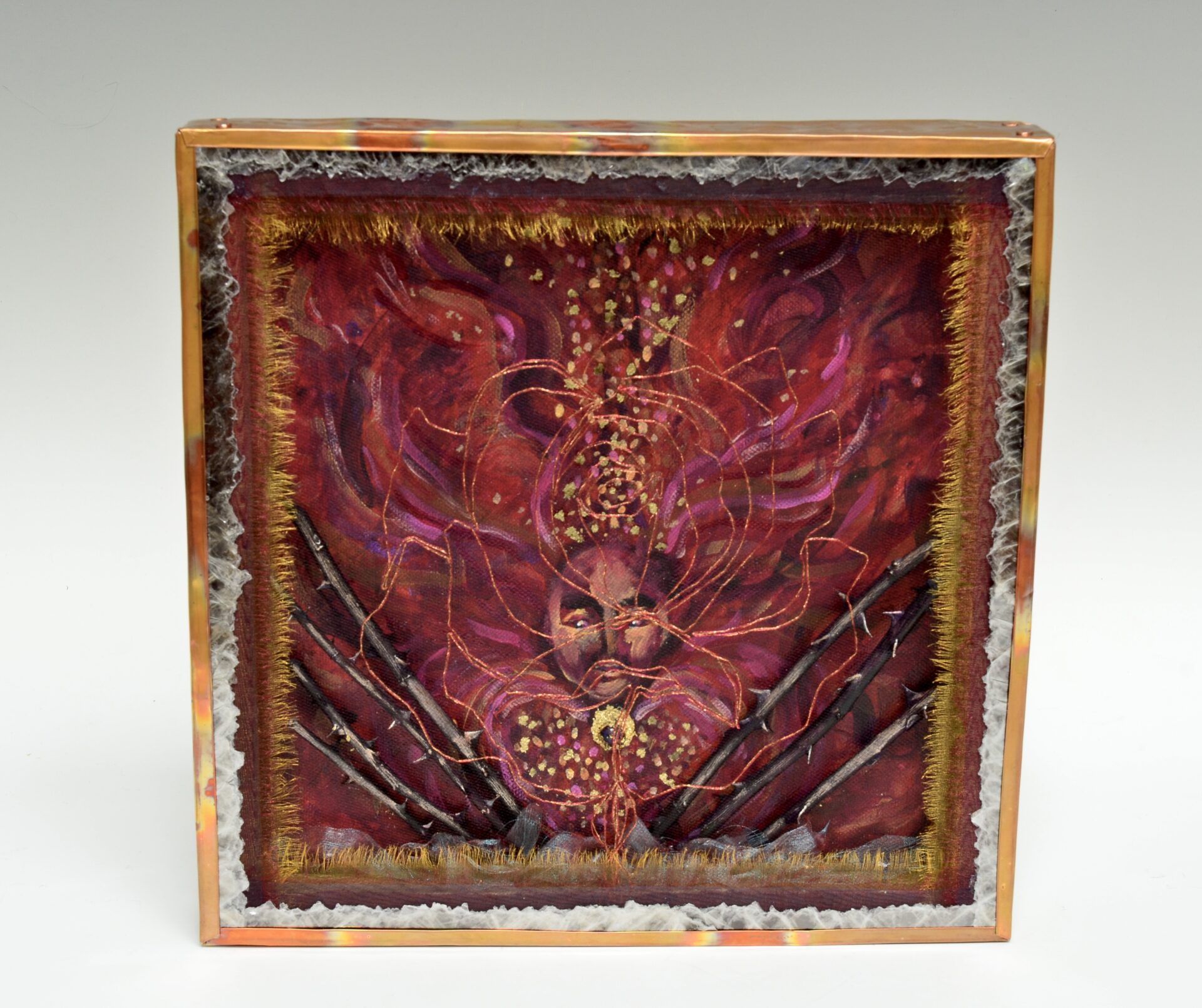 Paint on canvas, stitched drawing on transparent fabric overlay, silk organza, mica, rose thorns, vintage glass jewel, copper, wood.